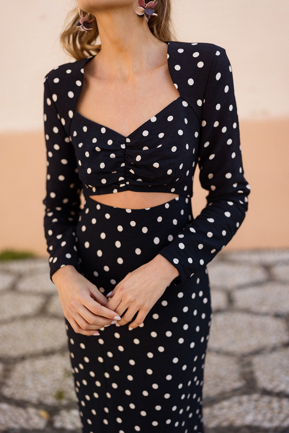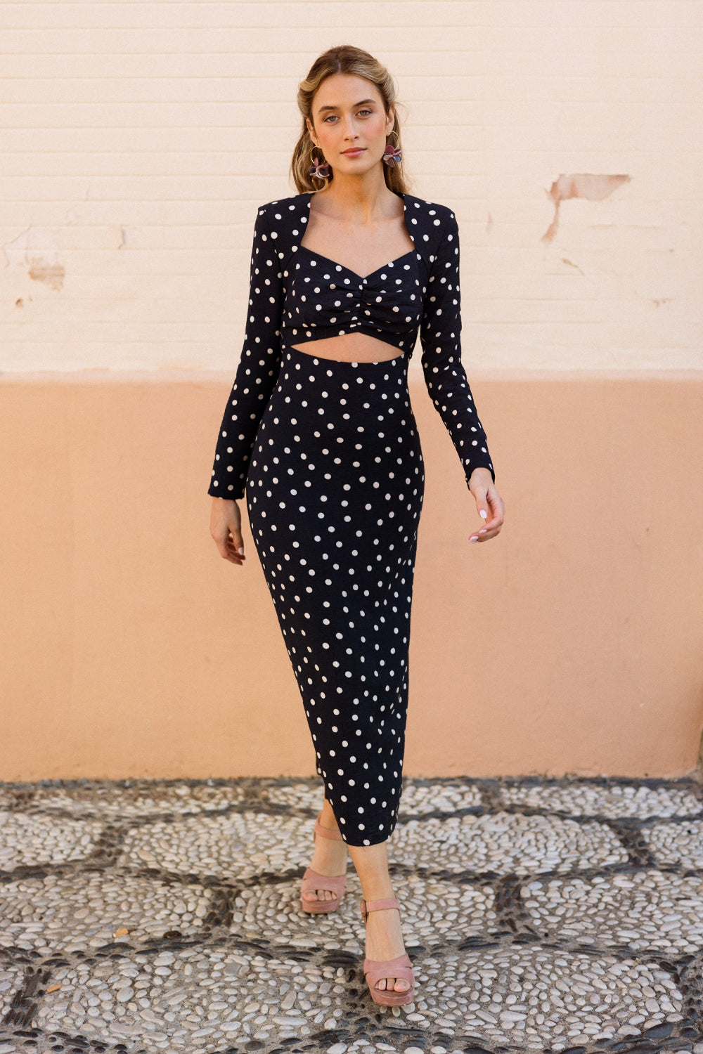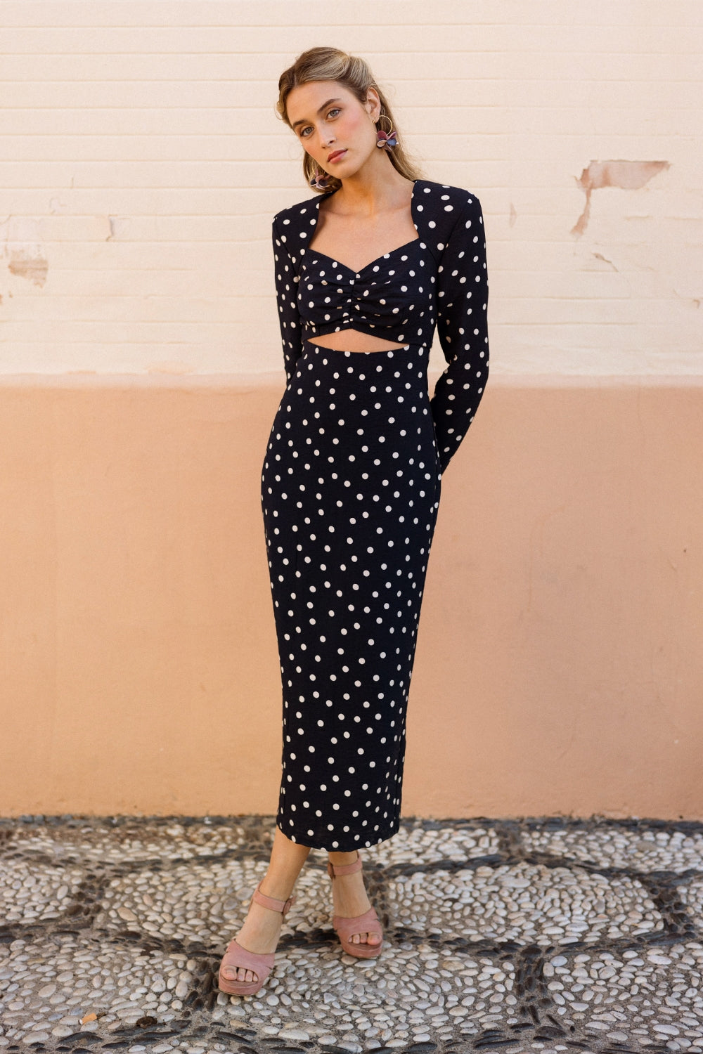 Sofía se convertirá en un imprescindible para esta temporada, sus aberturas cut out combinadas con un precioso estampado clásico de lunares presentan la combinación perfecta de actualidad y elegancia. Confeccionado en un maravilloso raso bámbula con forro al tono.