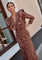 La robe la plus flatteuse pour la silhouette féminine, confectionnée en coton brodé couleur chaudière. Elle présente un décolleté en V orné d'un volant décoratif, des manches légèrement bouffantes et une fronce centrale qui sublime la silhouette. La jupe droite fendue sur le devant ajoute une touche de mouvement. Elle se ferme par une fermeture éclair invisible au dos.