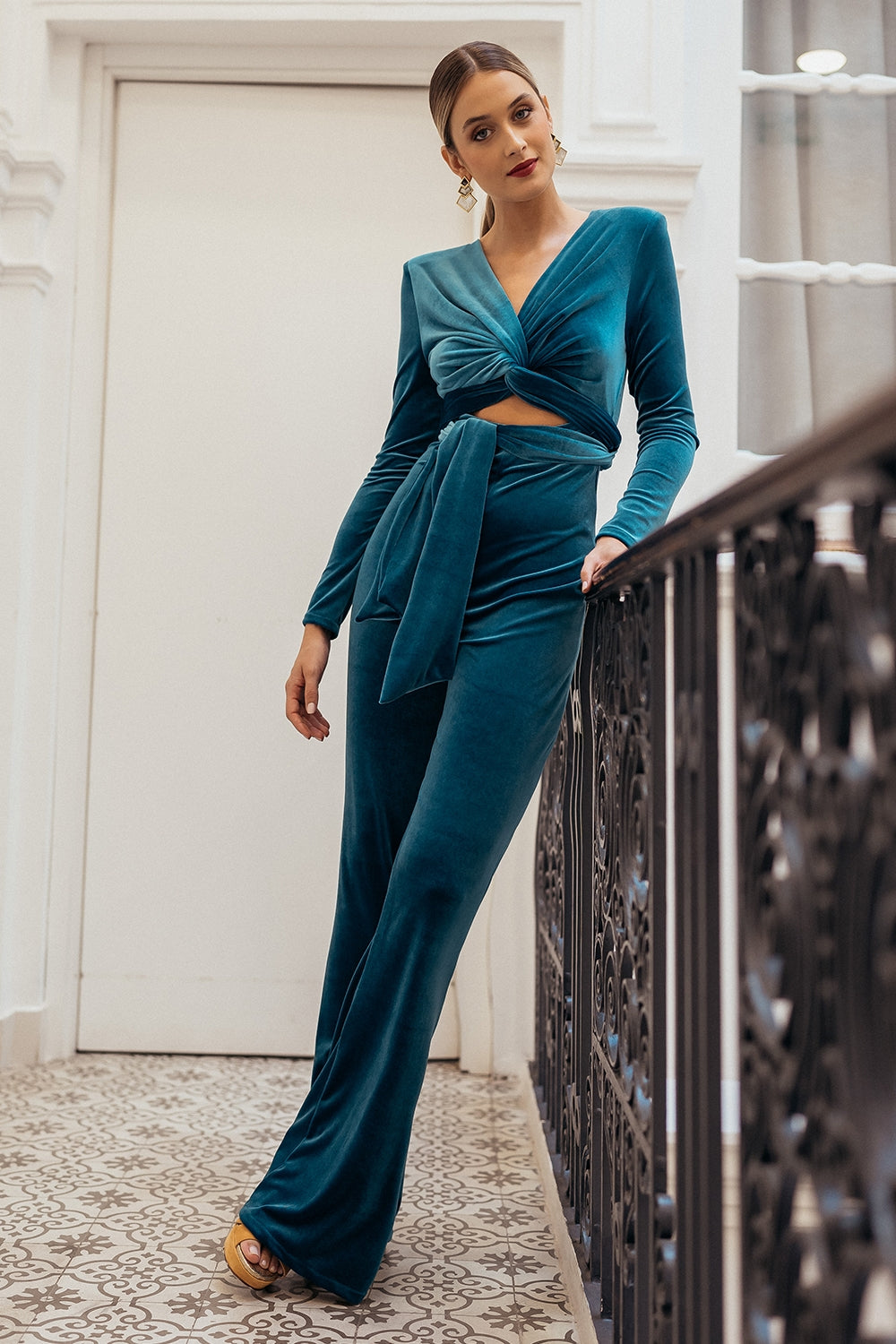 Originale, élégante et polyvalente, notre combinaison Azumi, confectionnée en velours extensible bleu pétrole, présente un pantalon légèrement évasé, une petite découpe, un nœud drapé et une ceinture à nouer.