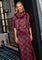 Robe longue imprimée dans des tons marron et rose, confectionnée en bambou semi-opaque. Sans manches, elle présente un col montant doublé, tombant au-dessus du genou. Une cape asymétrique intégrée ajoute du mouvement et se termine par un faux nœud drapé sur le devant. Elle se ferme par une fermeture éclair invisible au dos et des boutons recouverts.