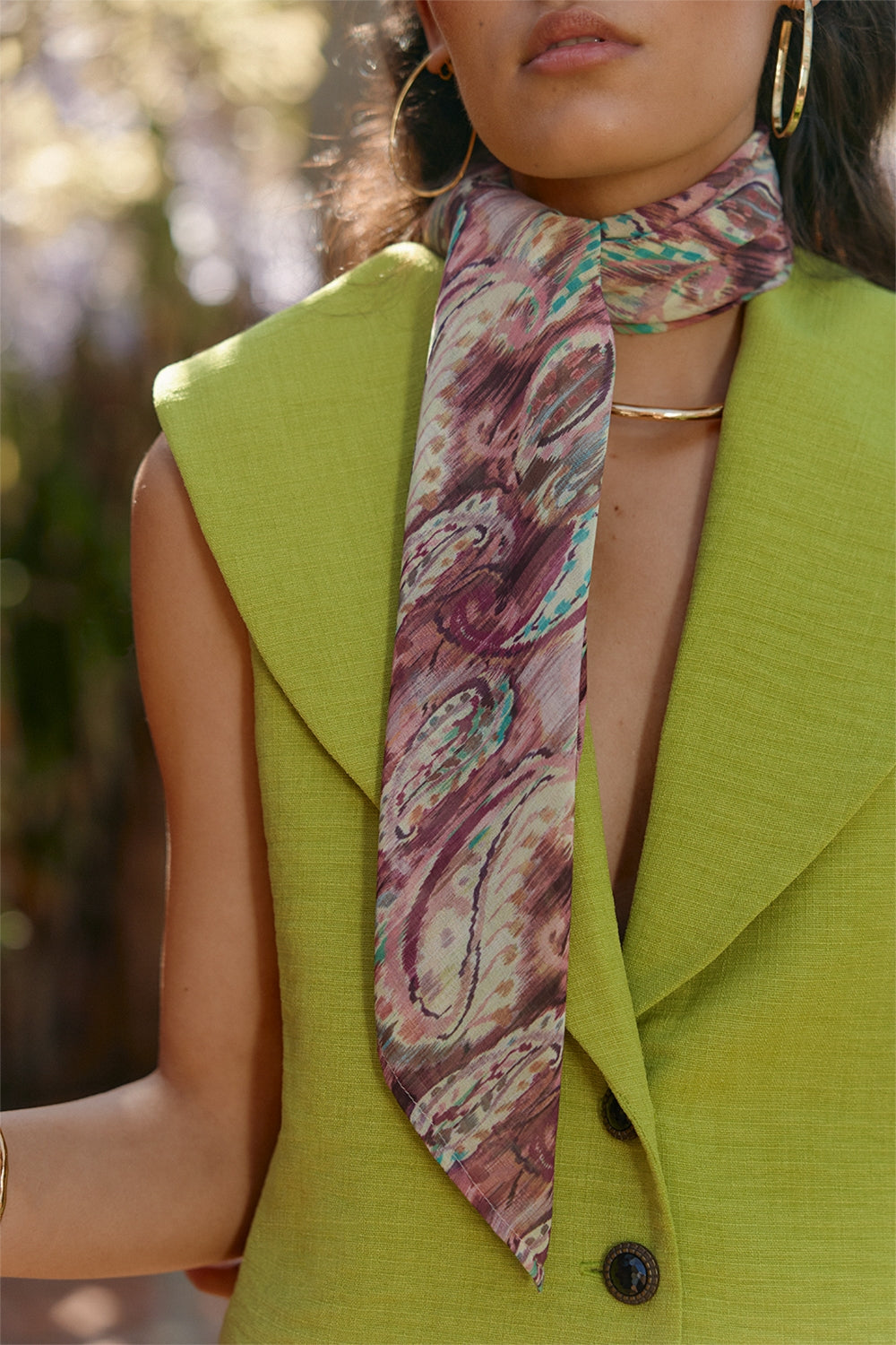 Foulard à imprimé cachemire dans des tons roses. Élégant et polyvalent, il peut être noué autour du cou, porté en accessoire de cheveux ou accroché à un sac à main. Parfait pour ajouter de la couleur et de la sophistication à n'importe quel look. Dimensions : 70 x 70 cm.